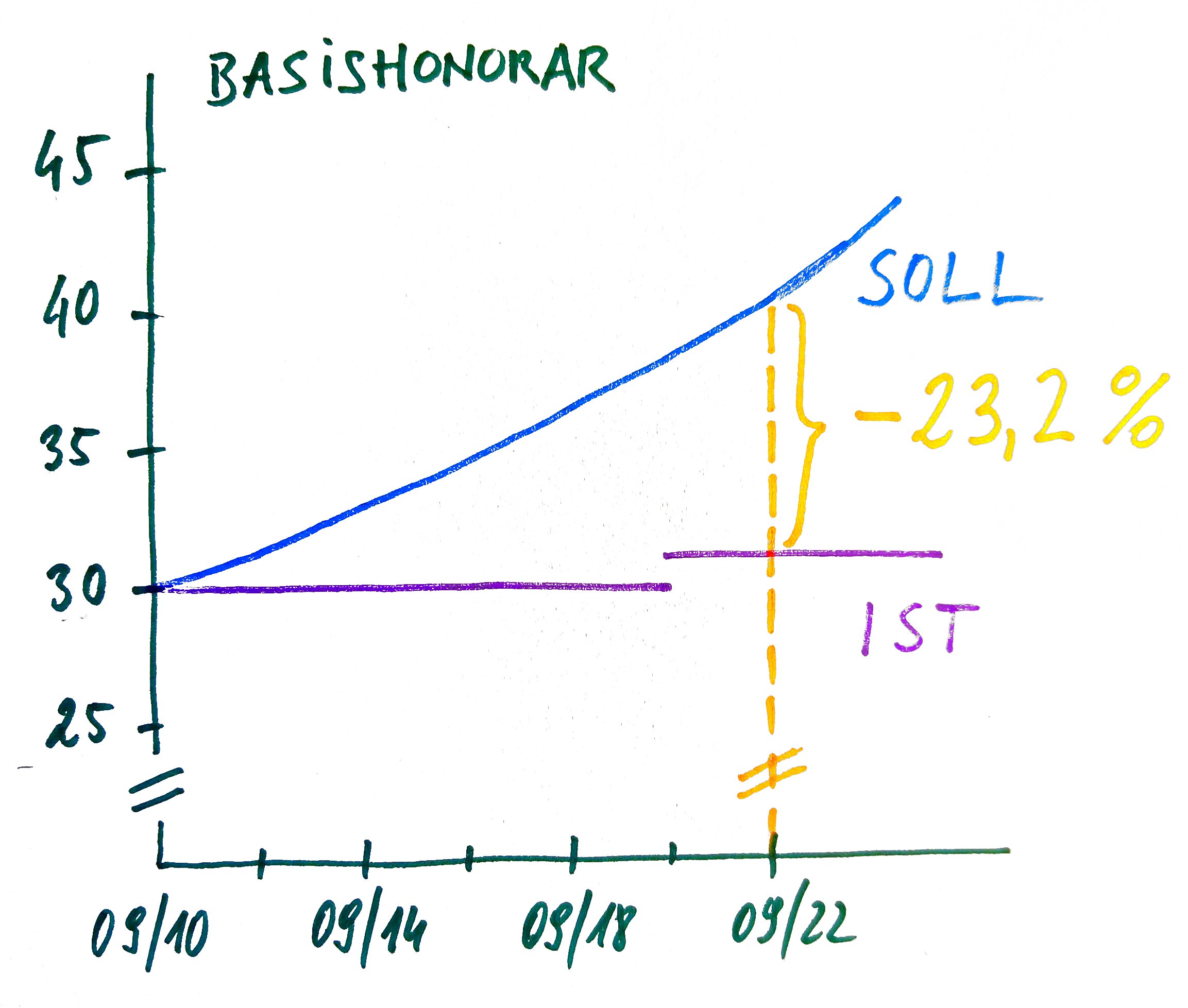 Zeit, dass wir ein Honorar einfordern, das unseren Leistungen gerecht wird! Die Minimalforderung muss das Niveau von 2010 sein, also ein Plus von 30 Prozent. Zudem ist eine Valorisierung unseres Honorars unumgänglich, da eine punktuelle Erhöhung die Inflationsdynamik und damit unseren Einkommensverlust nicht bricht.